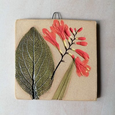 Handmade botanical tile made using the garden flower Crocosmia and a Foxglove leaf.