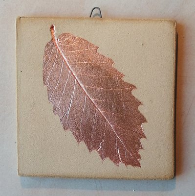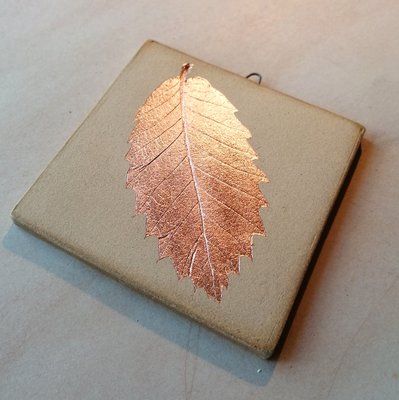 Handmade botanical tile, made using a sweet chestnut leaf from Roslin Glen, stoneware clay and copper leaf.