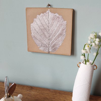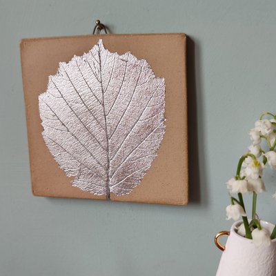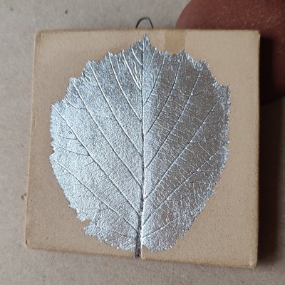 Handmade botanical tile, made using a hazel leaf from Roslin Glen, stoneware clay and aluminium leaf. Because real silver leaf tarnishes, I use aluminium leaf for my silver gilding, to reduce the amount of tarnishing over time.